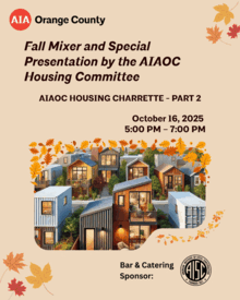 AIA Orange County Fall Mixer and Special Presentation by the AIAOC Housing Committee AIAOC Housing Charrette - Part 2 The Housing Charrette Part 1 last fall, showcased a 4.69-acre site in Irvine, where local architectural firms presented concepts for attainable housing through detailed site plans, elevations, and floor plans. The designs explored strategies to create attainable, high-quality housing while maintaining design excellence and livability. Part 2 shifts to focus on the innovative individual units developed by AIA Orange County emerging professionals. These designs will be crafted to explore the challenges and solutions in creating attainable for sale housing, while exhibiting creative approaches to livability and quality of life. Attendees will engage in a review and discussion of the submitted individual unit concepts, gain insight into the practical considerations and design decisions needed to achieve attainable homeownership in Orange County, while also learning about energy efficient design. Each submission was required to work within a maximum $300,000 purchase price, using the original site as a framework for understanding how AIAOC members continue to address the regions housing affordability crisis through thoughtful, high-quality design solutions. Teams focused on cost-effective construction techniques, incorporating energy-efficient systems to reduce long-term utility costs, and offering a variety of unit sizes to appeal to different buyers. The proposed solution balanced affordability with quality, ensuring the housing units meet the high standards expected in Orange Countys competitive market. You will be impressed with these designs! Come on out and check out the projects, hear from the designers, get some dinner, earn one AIA HSW Unit, and have some fun too!